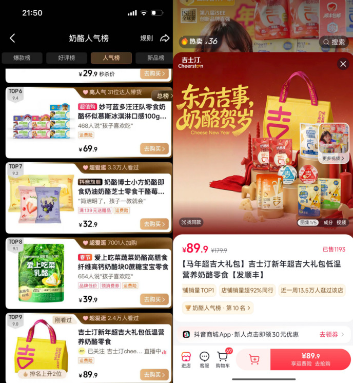开播首日,吉士汀直播间即登上抖音人气榜第三名、乳制品类目带货榜第一名。2月14日情人节,品牌推出26年新品大满贯“马年超吉大礼包”,单场直播热卖超千单。截至2月20日,其抖音旗舰店一周吸引13.5万人次浏览,单品链接冲入抖音全站奶酪人气榜前十,同时占据类目榜、直播榜、带货榜三榜第三。